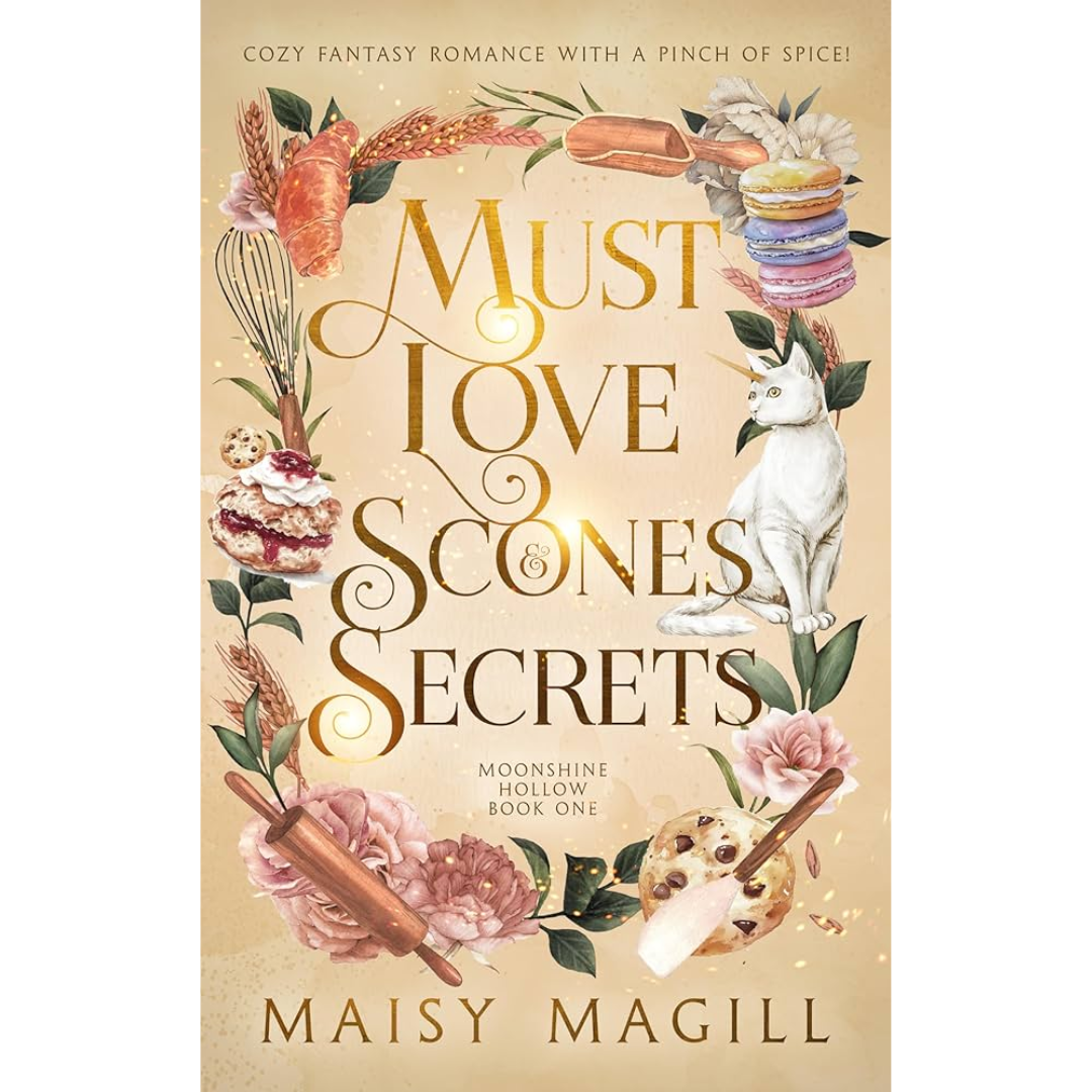 Must Love Scones and Secrets is a spicy cozy fantasy romance full of enchanted pastries, mischievous caticorns, and a love story that will warm your heart.